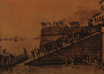 O quadro de Debret retrata o embarque da Família Real de volta a Portugal em abril de 1821