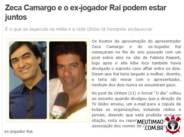 No post de Ontem (11) o Jornal “O dia” voltou ao assunto quando divulgou que a direção da TV Globo enviou, um e-mail para a cúpula de todas as organizações, incluindo rádios e jornais, dizendo que está proibida qualquer citação, nota ou reportagem em que haja a associação dos nomes de Zeca Camargo e do ex-jogador Raí.