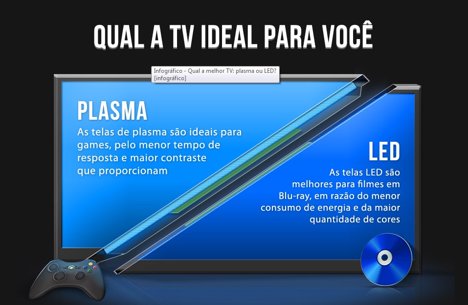 O sonho de muitos brasileiros é ter em sua sala uma TV bem grande preta e fina de 40 polegadas ou mais até 60 polegadas para curtir aquele filme ou aquele jogo de futebol em épocas de Copa do Mundo. Porém muitas dúvidas surgem quando temos que escolher entre a Tecnologia LED e a Tecnologia Plasma, ambas possuem suas vantagens e desvantagens e você vai saber agora. Vou deixar a LCD de lado, pois ela se torna irrelevante se o termo aqui for qualidade.