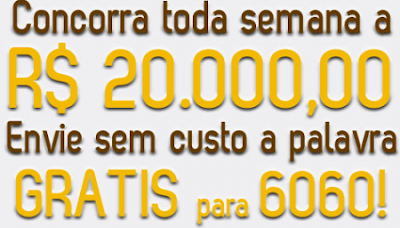 Enviar um SMS gratuito com a palavra ‘GRATIS’ para 6060 e já ganhe 1 cupom parao sorteio semanal de R$ 20.000*.